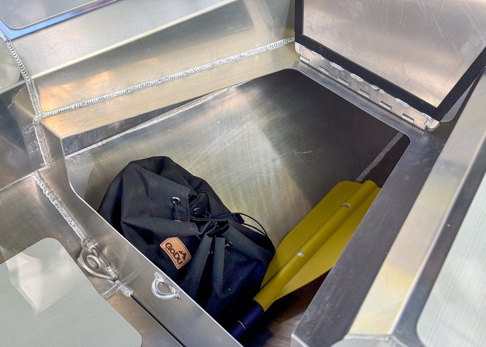 The bow locker is big enough to hold a 6 US Gallon bow tank, the Compact Anchor Kit, Collapsing Paddle and four life vests. Easily secured by a simple and reliable pad lock looped through standard GoDu deck rings, the locker is designed to keep your property safe and dry from rain and spray.